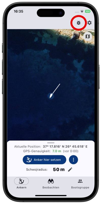 Tippe auf den Bugreport-Knopf oben rechts